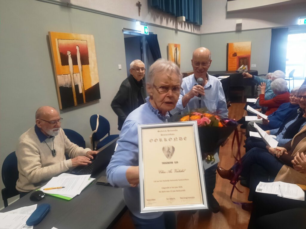 De bestuursverkiezing vraagt ook de aandacht van de leden. Mw. Chris-An Verbakel is reglementair aftredend en stelt zich niet meer herkiesbaar. Zij is 26 jaar bestuurslid geweest en heeft vele jaren als penningmeester haar bestuurstaak nauwgezet uitgevoerd. De voorzitter dankt haar voor haar inzet en betrokkenheid bij het SHS. Tijdens haar penningmeesterschap was het koor nog niet zo digitaal ingesteld, contributie werd door haar op elke eerste maandag van de maand geïnd. Haar jaarrekeningen klopten op de cent nauwkeurig. De voorzitter onderstreepte zijn dankwoord met een oorkonde van verdienste, een cadeaubon en mw, Ann Bogaarts overhandigde een mooi boeket. Dhr. Nico Vaessen, secretaris, heeft zich herkiesbaar gesteld voor opnieuw een periode van drie jaar. Met applaus wordt hij herbenoemd. Mw. Anita van Oudenhoven heeft zich kandidaat gesteld voor een bestuursfunktie. Bij acclamatie wordt zij benoemd. Zij dankt de leden voor het vertrouwen wat zij krijgt. Ze ziet het als haar taak om te werken aan verbinding.